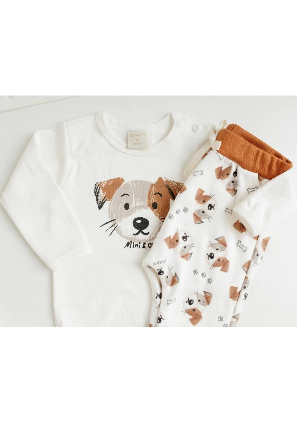 Body manga longa em algodão egípcio na cor marfim com estampa Cachorrinhos E Calça em microsoft com estampa Cachorrnhos, com cordão para amarrar. Fácil de vestir, o body possui abotoamento de pressão no ombro e entre as pernas, Pensando sempre no máximo conforto para o bebê!
