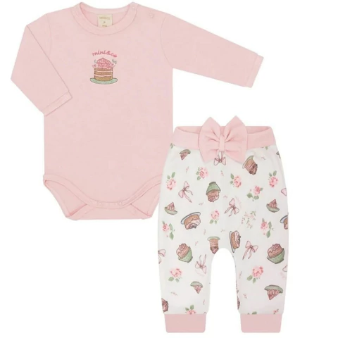 Body manga longa em algodão egípcio na cor rosa com estampa bordada Esquilinhas e calça em microsoft na cor marfim com estampa Esquilinhas, e detalhe de laço. Fácil de vestir, o body possui abotoamento de pressão no ombro e entre as pernas, pensando sempre no máximo conforto para o bebê!