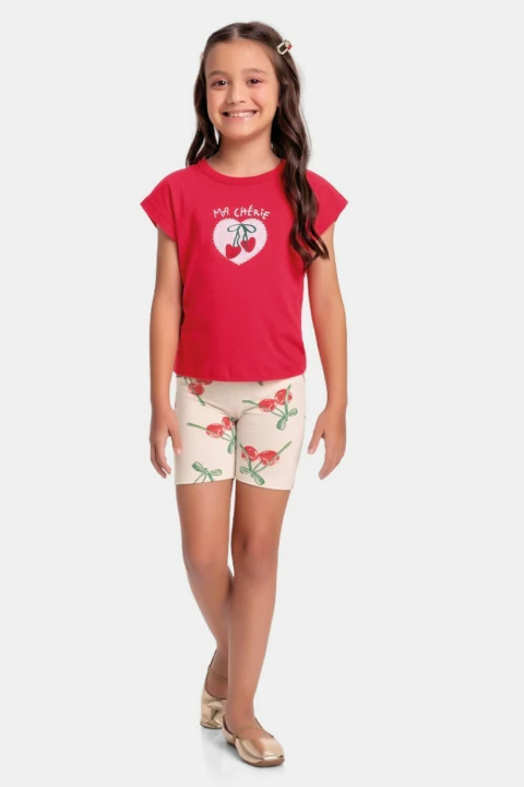 Estilo e conforto para as pequenas com este conjunto blusa e ciclista. Modelo possui blusa com mangas curtas, estampa frontal de cerejas, ciclista com estampa rotativa combinando, comprimento acima do joelho e modelagem confortável.