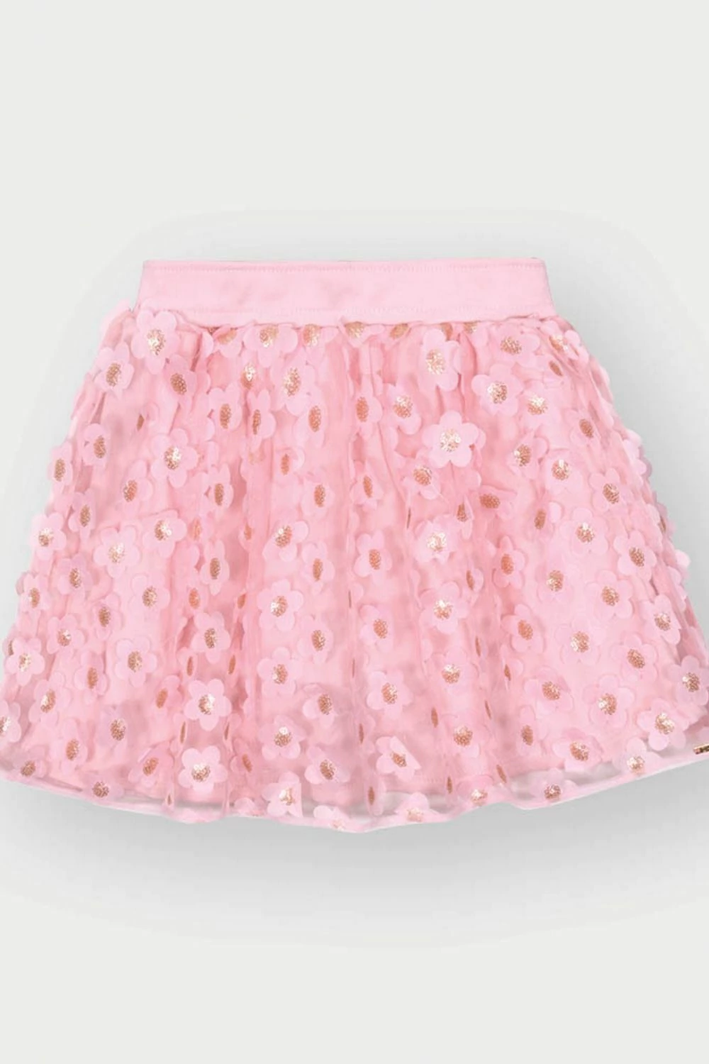 CONJUNTO INFANTIL MENINAS CINTI NATURAL/ROSA, COM BLUSA MANGA CURTA DE BABADOS E BORDADO PRÓXIMO A GOLA E SAIA EM TULE COM ALIQUES DE FLORES COM BRILHO E CÓS ELÁSTICO. MUITO ESTILO E CHARME PARA AS MENINAS.