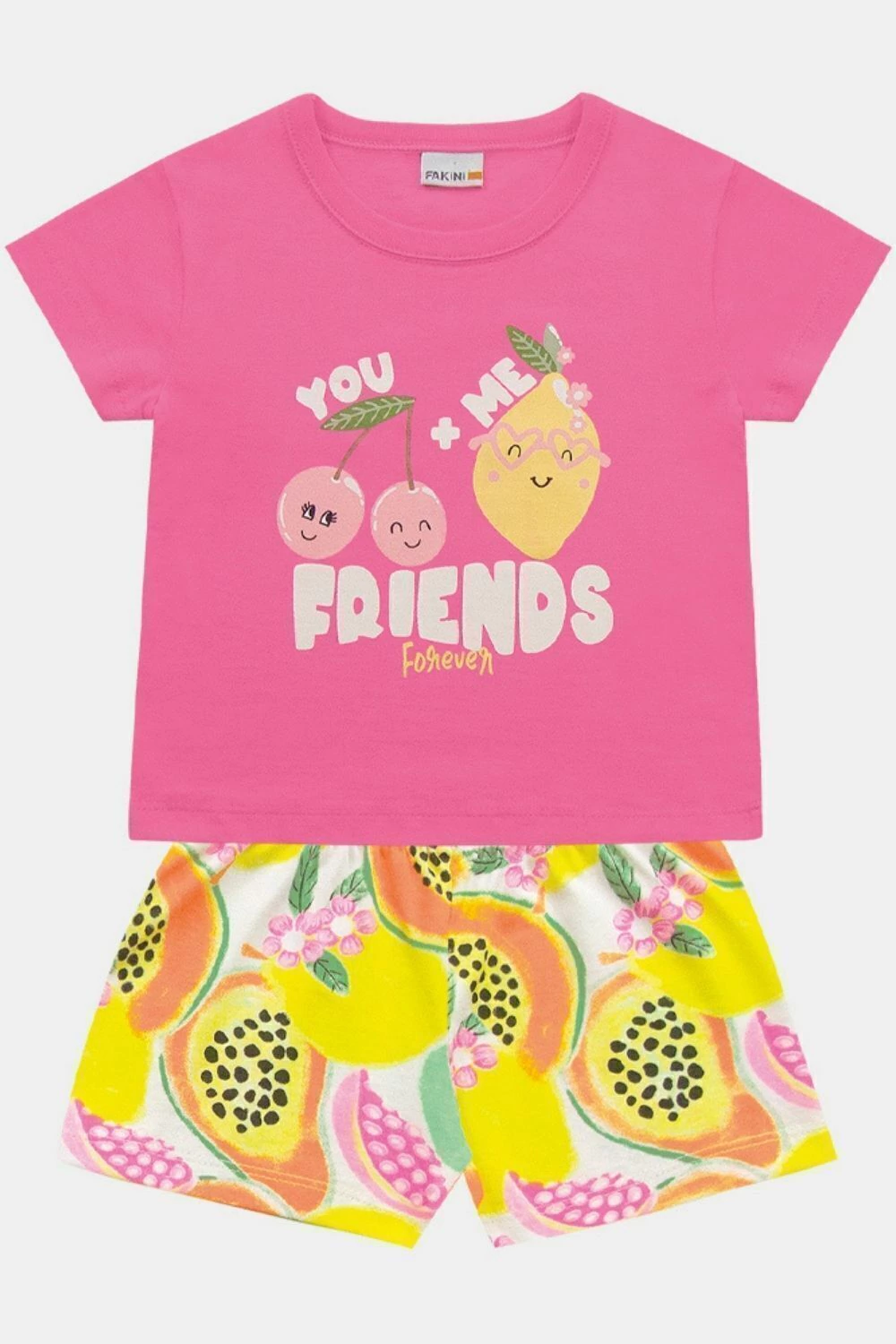 Look prático e encantador: blusa leve, manga curta, com estampa divertida de frutinhas combinada a short soltinho, com cós elástico e estampa rotativa de frutas. Perfeito para dias ativos com muito estilo.